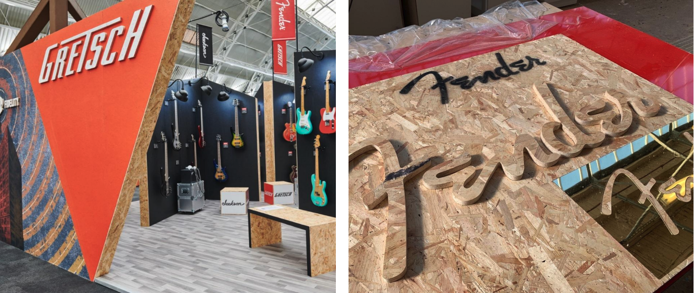 This sustainable exhibition stand for Fender Guitars combined OSB recycled board, natural wood beams, and innovative heat-pressed graphics. The result was a visually impactful stand that highlighted Fender’s commitment to eco-friendly practices and creative design.