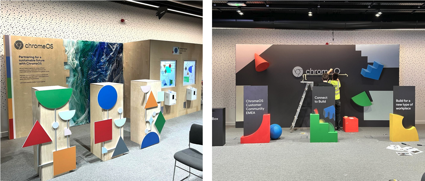 Our collaboration with Google Chrome showcases multiple sustainable exhibition stands, each built exclusively with eco-friendly materials like natural plywood and recycled graphic substrates. These projects exemplify how sustainability can elevate brand presence without compromising on style.